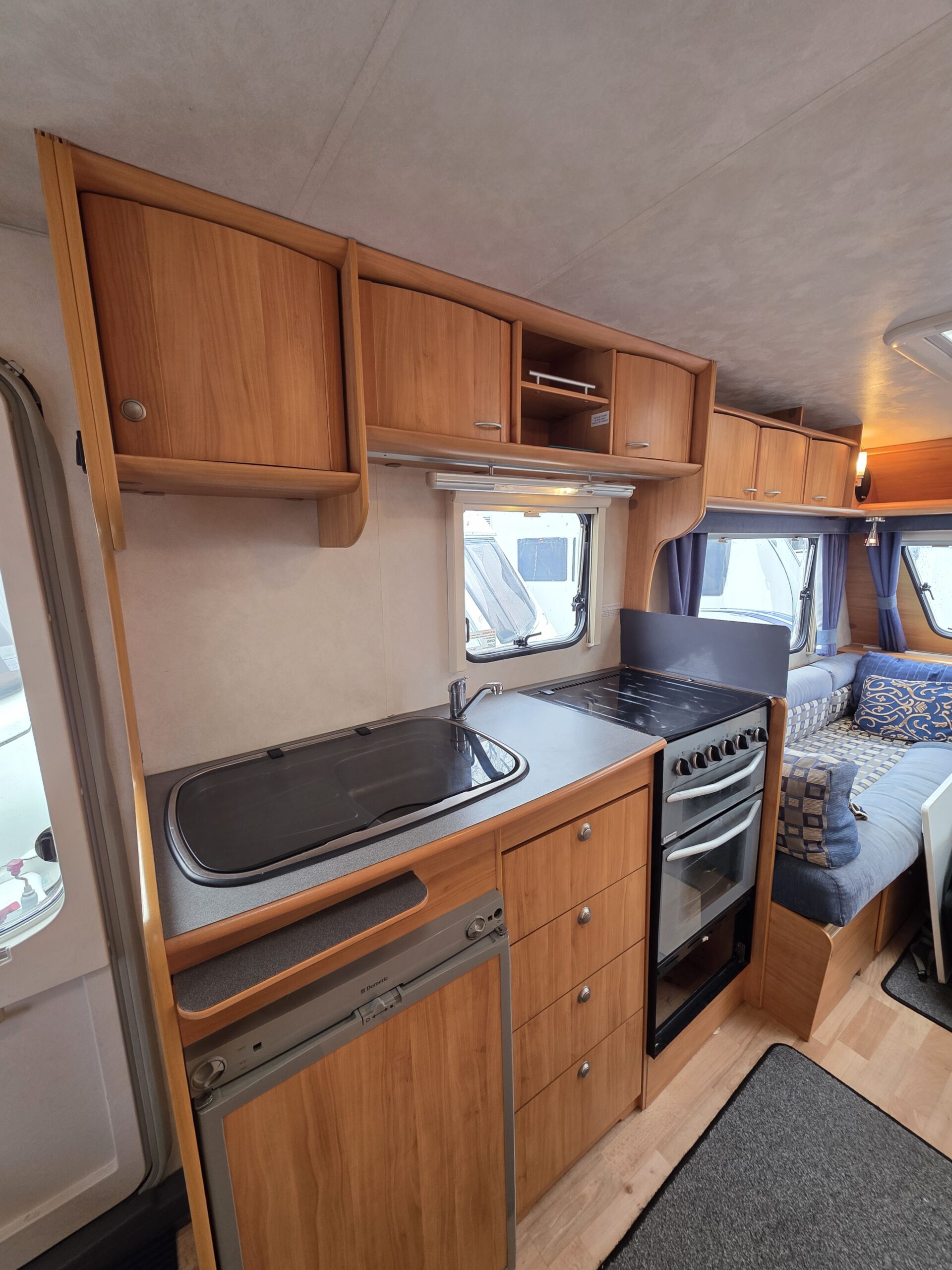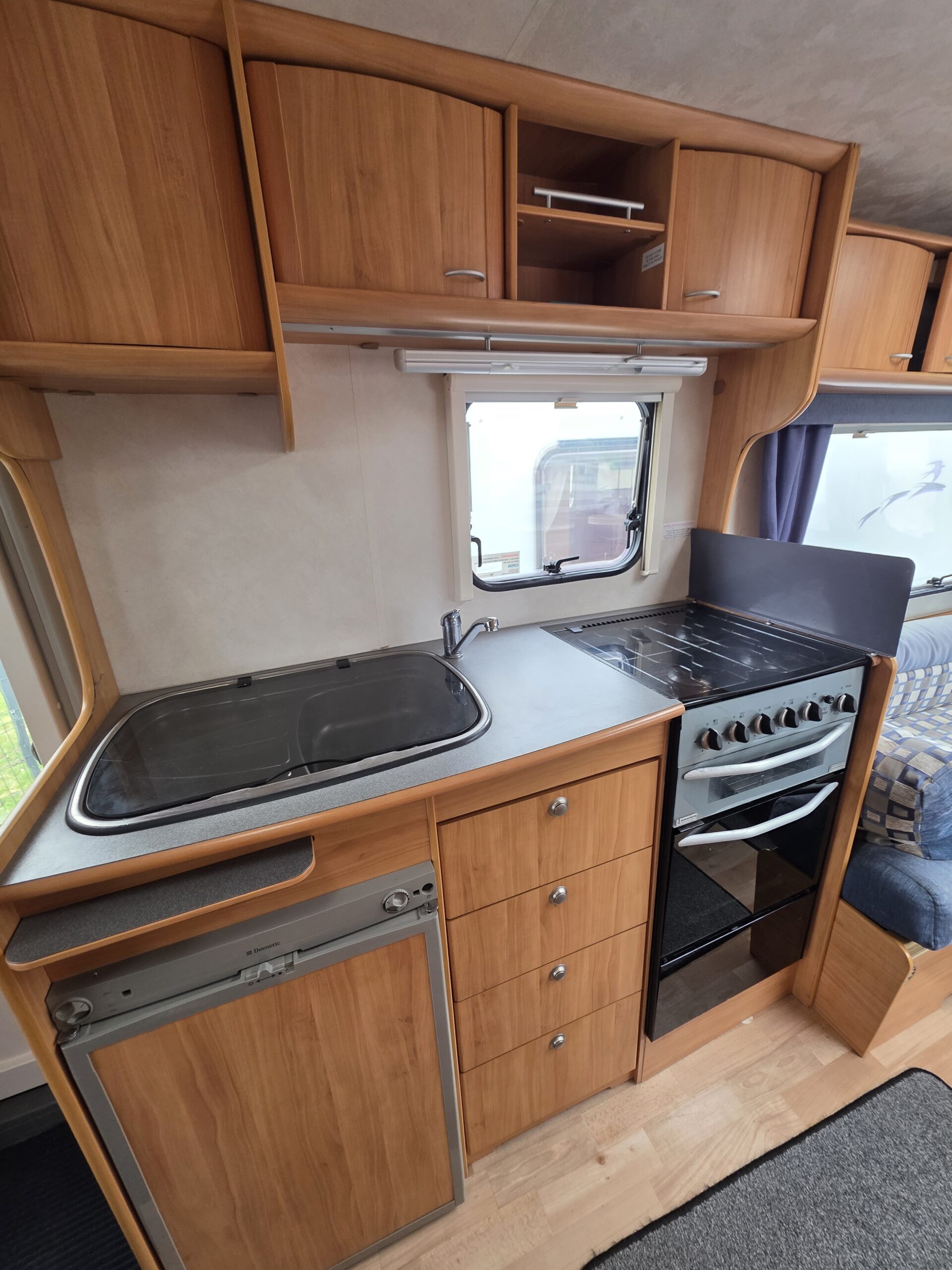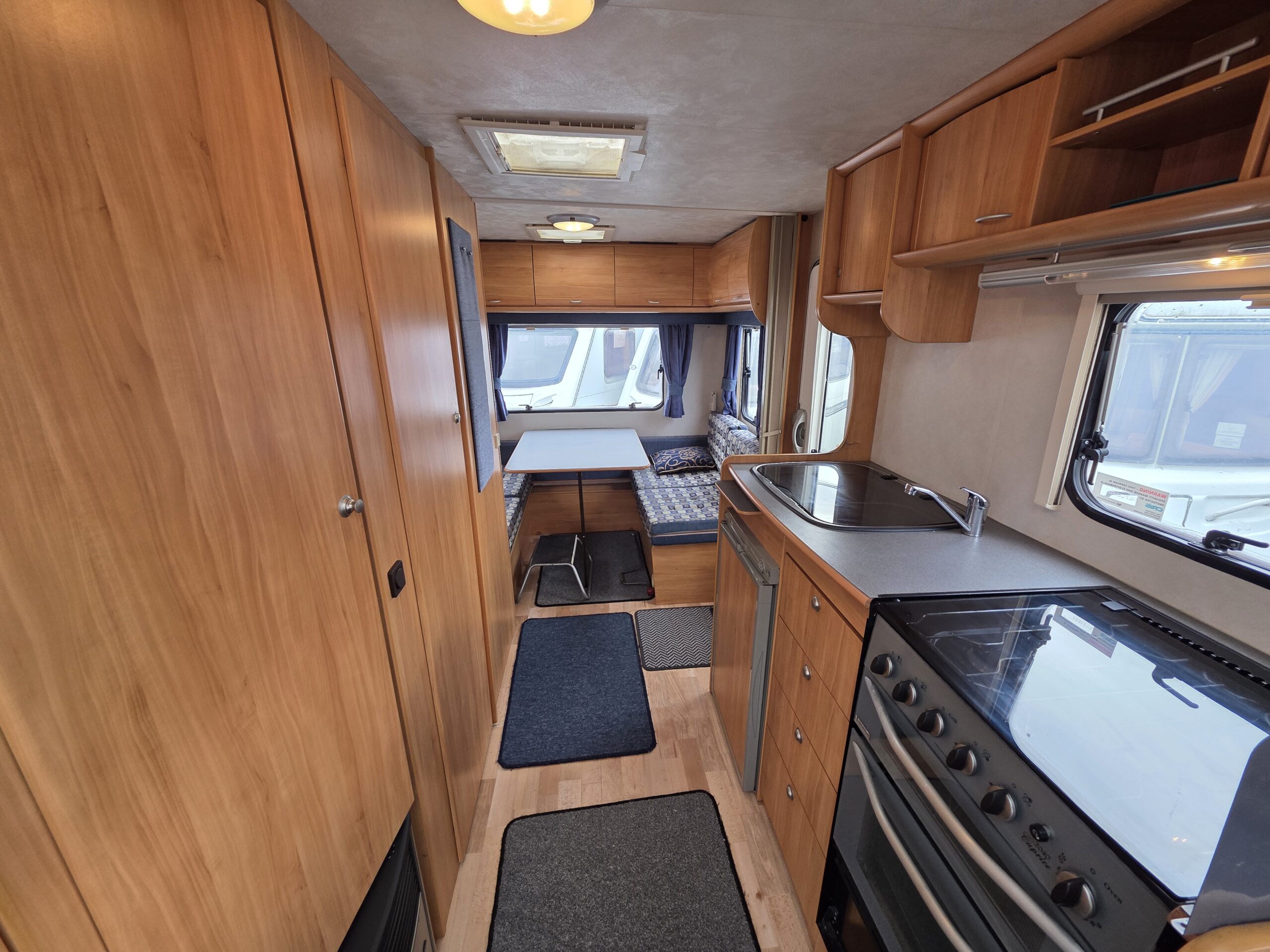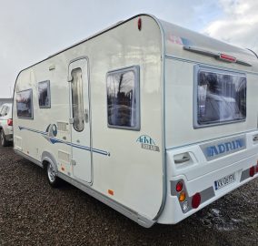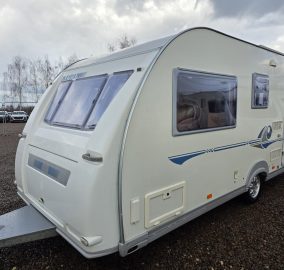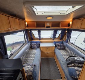 Przyczepa bardzo zadbana na zewnątrz i w środku, MEBLE TAPICERKA W SUPER STANIE. Przyczepa z układem 1 sypialnia na max 3 osoby-2 sypialnia dwa pojedyncze łóżka z możliwością rozłożenia na jedno duże + toaleta na boku przyczepy z kabina prysznicową jeden z najbardziej poszukiwanych układów dla 5 osób .
