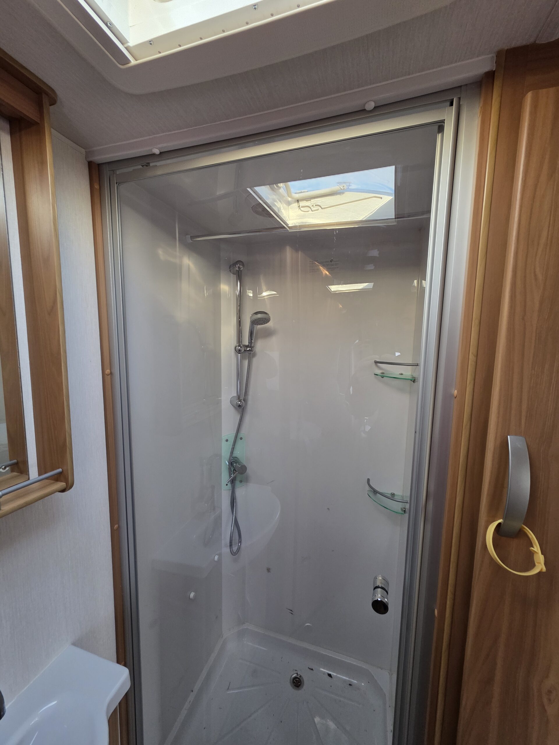 W przyczepie wszystko w świetnym stanie, tapicerka, meble, podłoga, łazienka, osobna kabina prysznicowa...