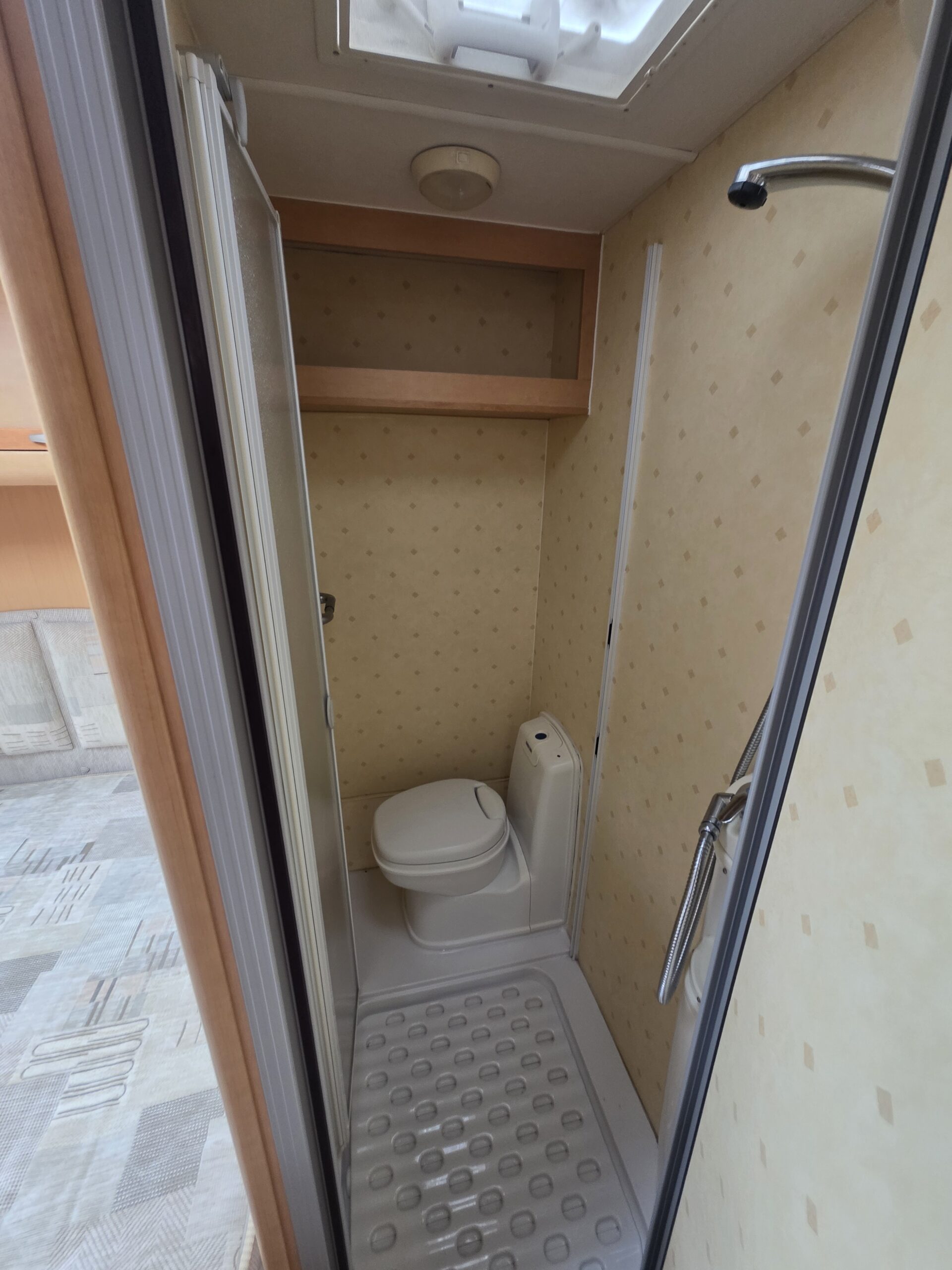 W przyczepie wszystko w świetnym stanie, tapicerka, meble, podłoga, łazienka, osobna kabina prysznicowa...